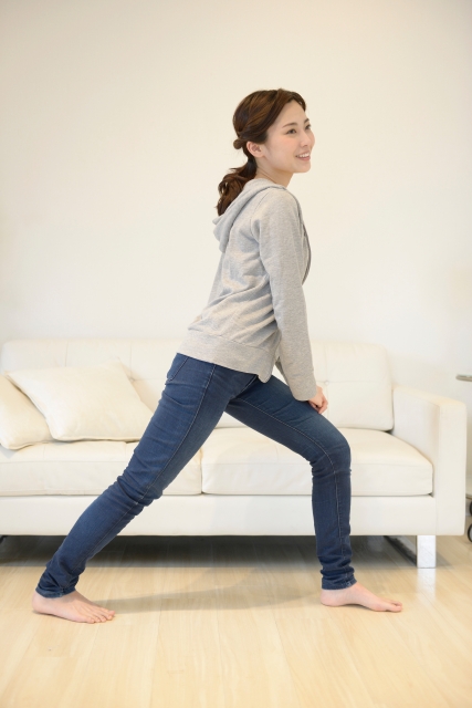 体育の授業でよくやったアキレス腱のストレッチです!ポイントは両足ともに指先を身体の向きと同じにまっすぐ向けることです!これが違う方向へ向いてしまうと効果がなってしまったり、膝を痛めてしまう事もあります。カカトは地面に着けたまま、反動をつけずにゆっくりと伸ばしてくださいね!
