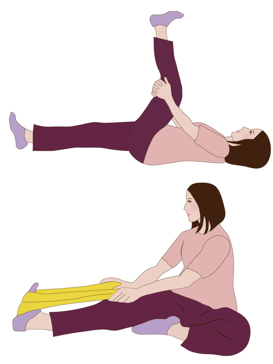 イラスト(上)はタオルを使用していませんが、仰向けに寝て、ももを両手で抱え込み身体に引き寄せます。もも裏やお尻のストレッチになりますよ!